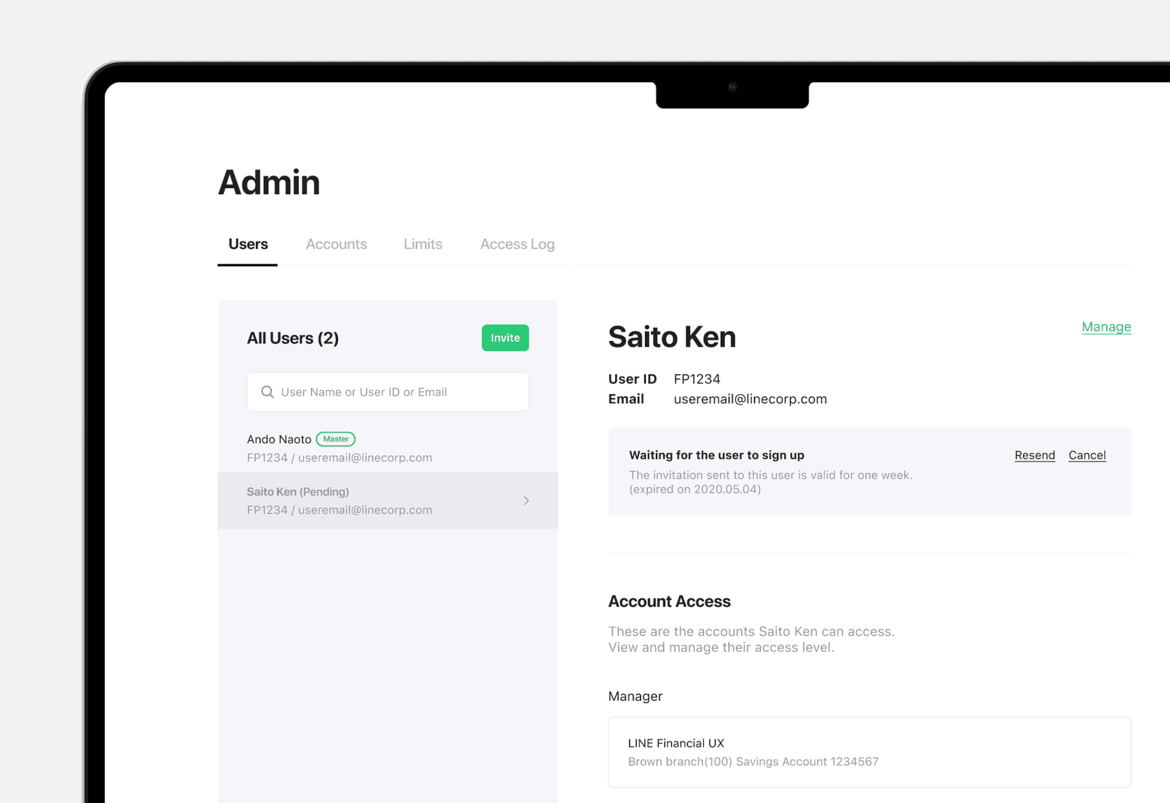 Users remain in a pending state until they accept an invitation. I made this status clearly visible in the user list and added options to resend or cancel invitations.