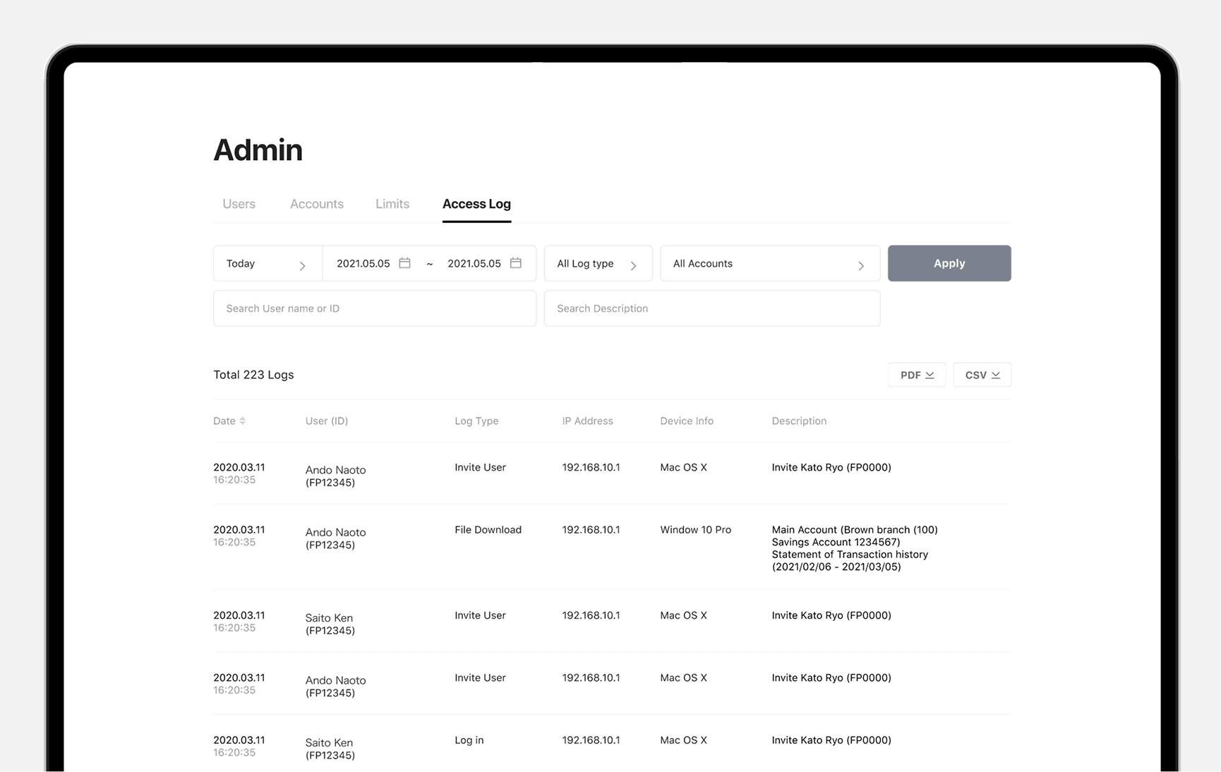 I designed an access log dashboard that lets Masters and Managers track user activity and filter logs by date, account, or user. Masters and Managers track user activity and filter logs by date, account, or user.