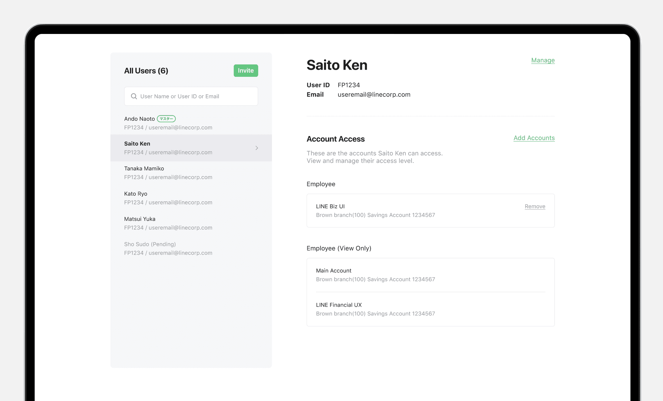 Design an admin page that gives Masters and Managers clear visibility and simple control over user access and permissions across accounts.