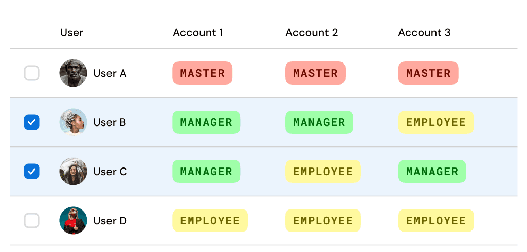 * Users B and C have Manager access for specific accounts,