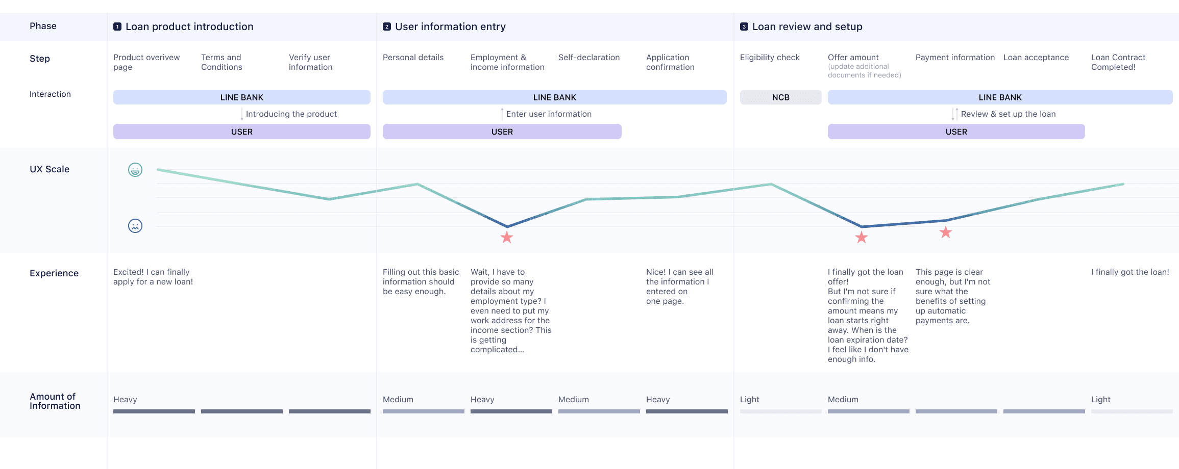 Since LINE Bank already offered loan products, we started by reusing the existing application flow. However, the high drop-off rates revealed clear usability issues. To understand the cause, I mapped the full user journey using user feedback and page level drop-off data.