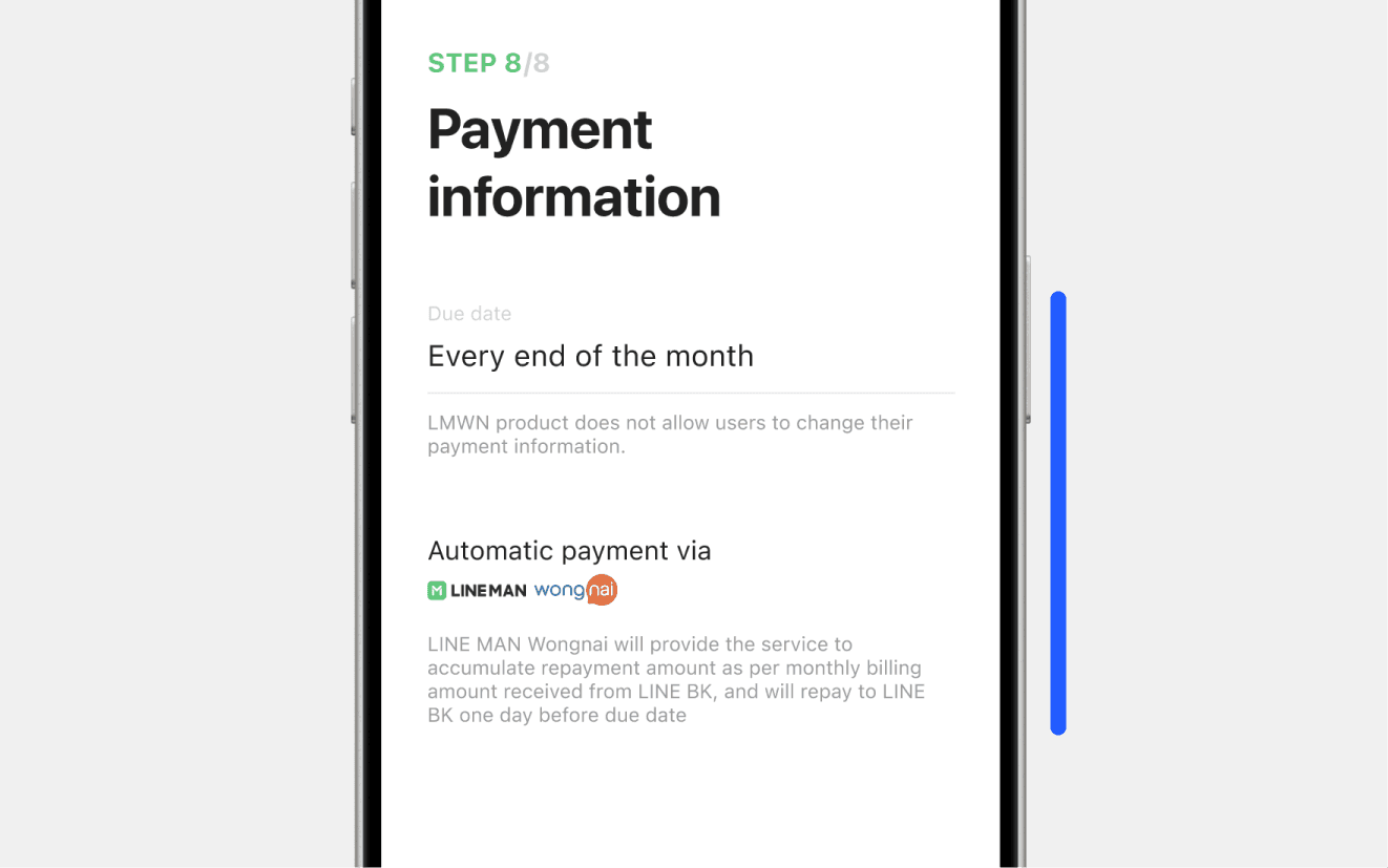 To improve repayment rates for small merchants facing cash flow issues, the loan was offered only to verified users on LINE MAN Wongnai. Unlike other LINE Bank loan products, monthly repayments were automatically deducted through the LINE MAN Wongnai platform.
