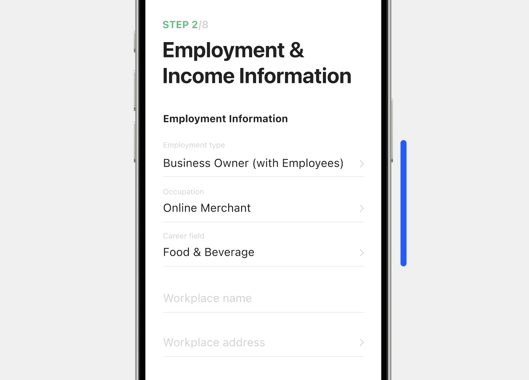 Since the loan was built in partnership with Thailand’s leading food delivery platform, most target users were F&B merchants. To reduce manual input, we pre-filled employment information wherever possible.